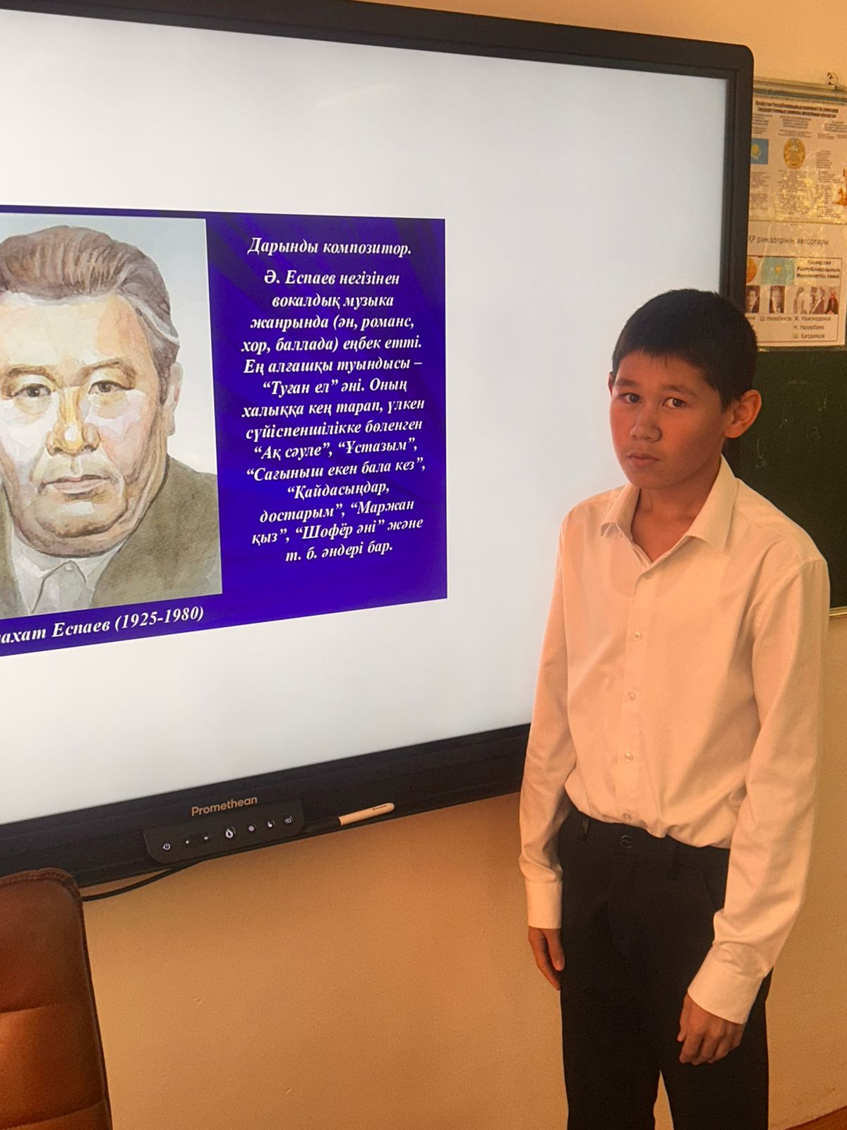 Шымкент қаласы білім басқармасына қарасты А.П.Чехов атындағы N21 жалпы орта білім беретін мектебінде Қазақстан мәдениетіне өлшеусіз үлес қосқан композитор Әбілах Еспаевтың туғанына 100 жыл толуына орай қазақ тілі және әдебитеті пәні мұғалімі 8 «Ә» сынып оқушылары арасында танымдық, тәрбиелік сағат өткізілді.